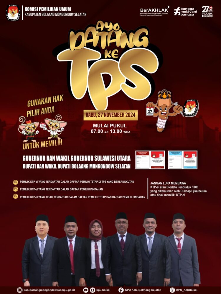 Dalam pengumuman tersebut, KPU Bolsel mengimbau masyarakat yang memenuhi syarat untuk hadir dan menggunakan hak pilihnya di tempat pemungutan suara (TPS).