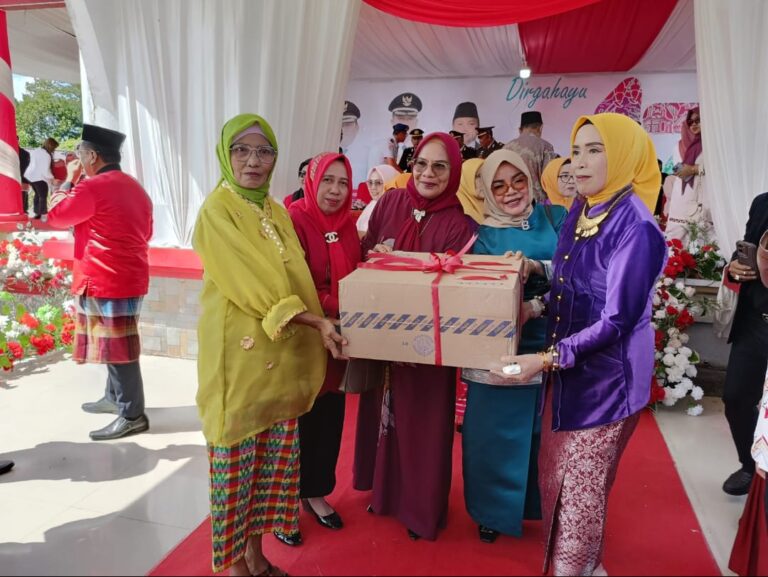 Didampingi Kepala Dinas Pendidikan dan Kebudayaan (Disdikbud) Rante Hattani, Bunda PAUD Kabupaten Bolsel Ny Selpian Kamaru Manoppo, menyerahkan secara simbolis wastafel (Tempat cuci tangan) untuk 5 Satuan PAUD, pada perayaan HUT Bolsel ke-17, di Alun-Alun Molibagu, Senin 21 Juli 2025.
